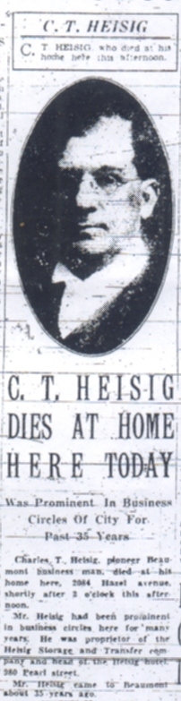 On January 10, 1901, after Patillo Higgins secured investors despite his four prior failed attempts at drilling, the Lucas gusher was discovered at Spindletop. The gusher spewed oil over 150 feet in the air and produced over 100,000 barrels of oil per day, more than the entire U.S. production combined, making Beaumont an instant mecca for investors. In May CT became one of the founders and first secretary of the Higgins Oil and Fuel Company which continued drilling at Spindletop and found the second major gusher. This was the second company formed by Patillo Higgins. Due to overspeculation and perhaps overextension into land buying, Higgins Oil and Fuel Co. was later absorbed by a larger company. (This will be the subject of a future article on this site; check back.) But CT’s investments were fruitful: he built the Heisig Hotel, owned the Heisig Storage Company, the Beaumont Coca-Cola Company, part of the Gray Building, was a founder of Gulf Steel Company (later Lone Star Steel Company) and a director of Citizen’s National Bank. CT spent a great deal of money and time backing agricultural enterprises in southeast Texas and at the time of his death he owned a rice farm and a large fig farm. In 1903, CT was listed in the Houston Post’s publication of “Men of Texas: A collection of portraits of men who deserve to rank as typical representatives of the best citizenship, foremost activities and highest aspirations of the State of Texas.”