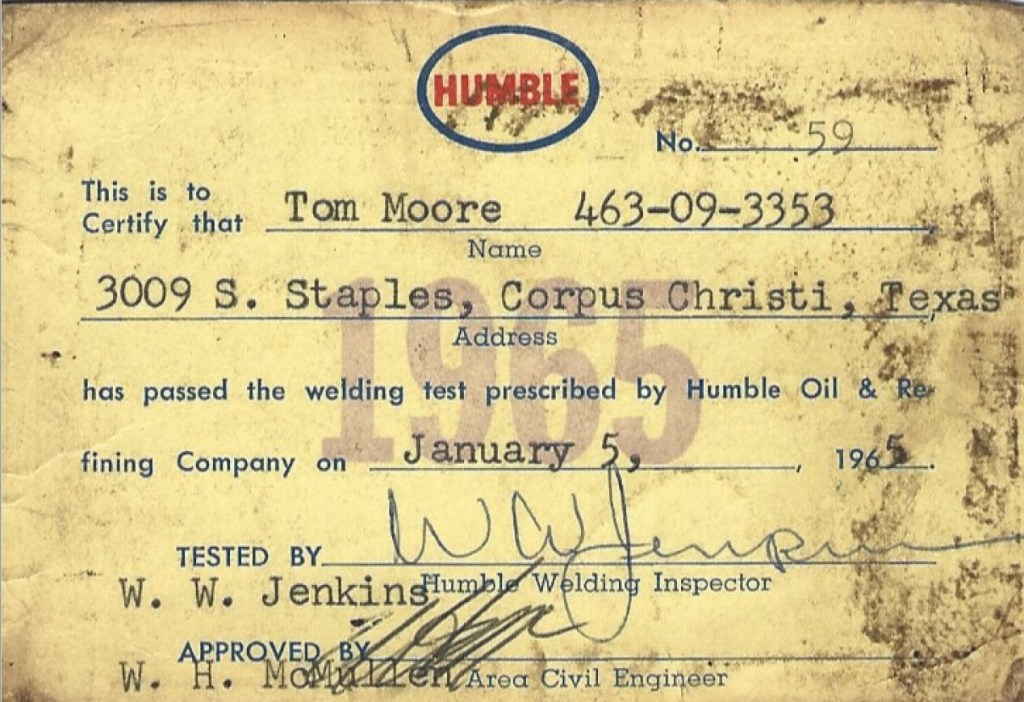TM was unhappy with his handshake arrangement with Dobson; he felt he had been promised more. He pushed the issue, and the businessman offered him a raise, which felt like a slight, so TM quit. At 51, he bought another welding machine and got a new welding certification card for his wallet from Humble Oil. For most of 1965 he worked for Olsen Engineering in Houston, earning half as much as he did working for Whataburger.