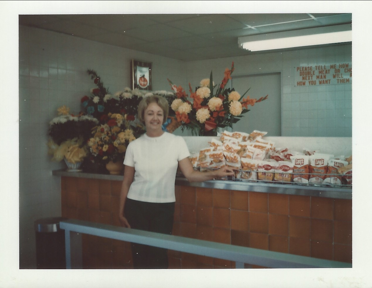 Mema also told us that Harmon showed up on Christmas Eve in a bundle of excitement, saying he wanted to make the restaurant bigger and more noticeable from the highway, at which point he and Daw “drew up the A-frame design with chalk on the floor of our garage” — which became the Whataburger restaurants with broad orange and white stripes visible from miles away.